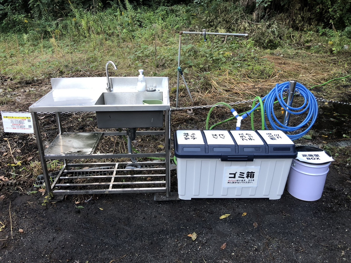 ・洋式トイレ24時間利用可能、流し台(上水道)、ゴミ捨て場完備