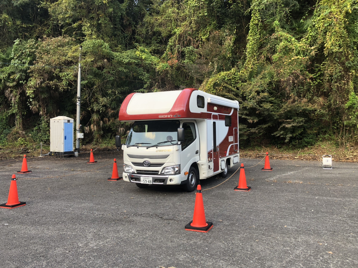 屋外で活動、サイドオーニング・机・椅子の展開、炭を使ったBBQも可能で、ドッグランも併設しています。犬はリードをつけて一緒に車外で過ごすことが可能です。設備は簡素ではありますが、上水道、洋式トイレ、グレー処理も可能で、全面アスファルトです。